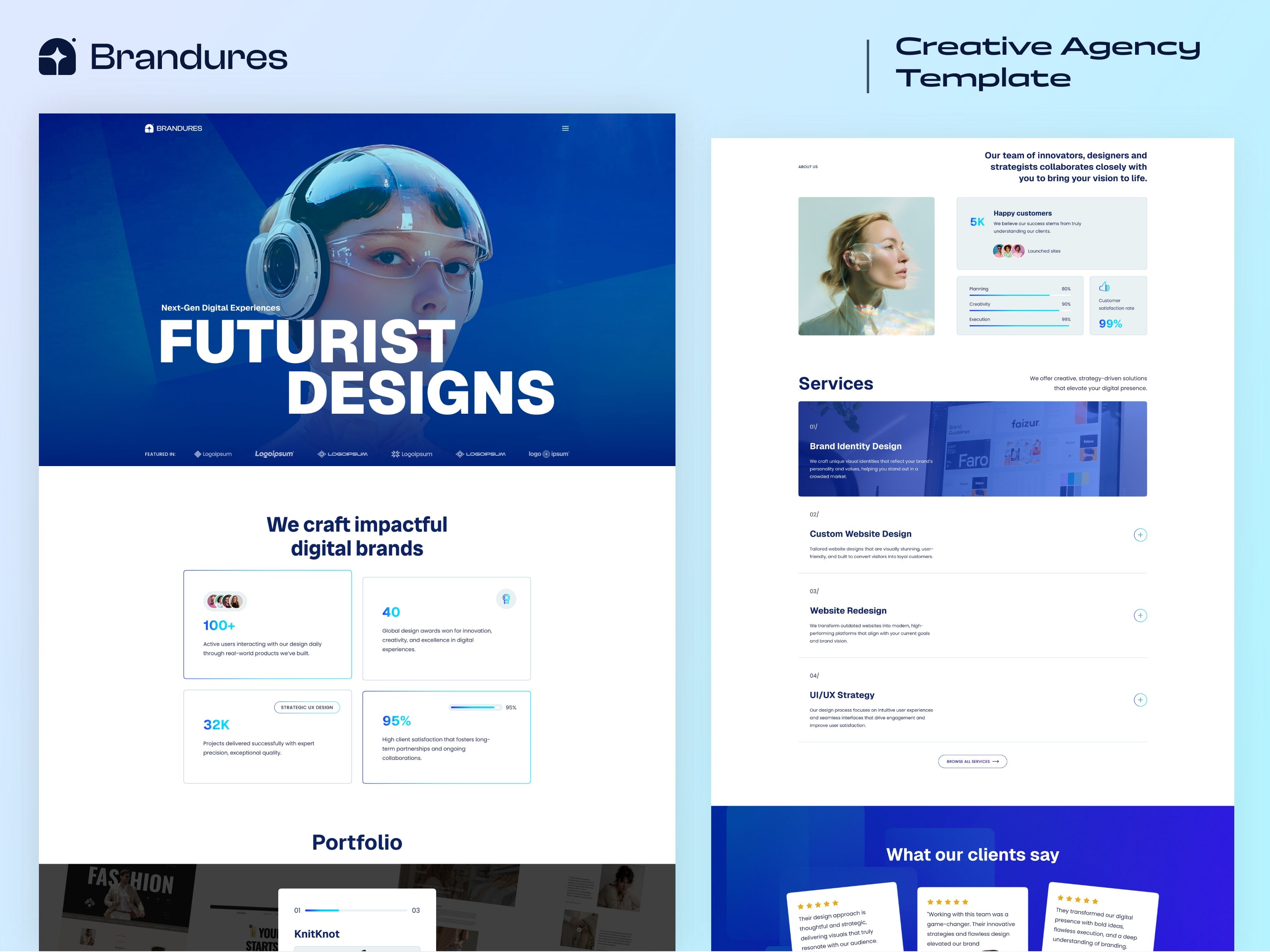Brandures – Creative Agency Template is a modern, high-performance Framer template built for digital design studios, branding agencies, and creative professionals. With its bold typography, sleek layouts, and fluid animations, Brandures makes a powerful first impression while keeping the user experience clean and intuitive. Every section is carefully crafted to highlight your agency’s strengths — from featured projects to client testimonials — all while staying fast, responsive, and SEO-friendly. Whether you're launching a new studio or refreshing your online presence, Brandures gives you the flexibility to stand out. Fully customizable in Framer with zero code, it empowers you to move fast, look polished, and showcase your creative work like a pro. Start building trust, attracting leads, and winning clients — all with Brandures. Pages: Home PageAbout PageServices PagePortfolio PageRequest a Quote PageBlog PageContact Page404 Error PageRefund Policy:All digital sales are final, and refunds are not available. Ensure you’ve reviewed the product details, and feel free to ask any questions before purchasing.Exclusive Offer:Get 3 months of Framer Pro (annual plan) free with your template purchase. Use the provided discount code when subscribing to a Framer pro plan. partner25proyearlyPreview HereRefund Policy