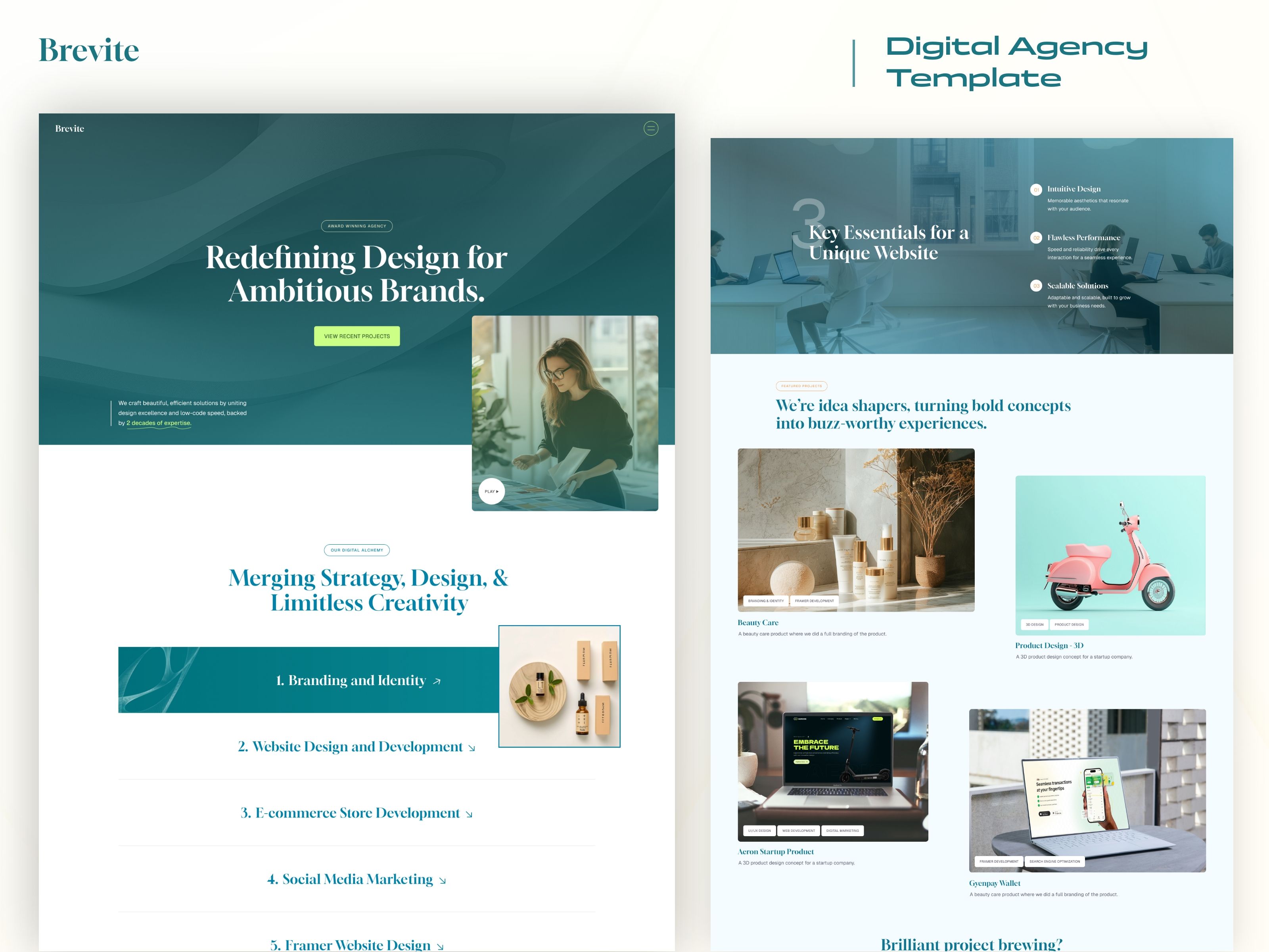 Brevite: Where Creativity Meets ImpactSay hello to Brevite, the Framer template crafted for digital agencies that dare to be bold. With its clean lines, striking typography, and fluid animations, Brevity turns your portfolio, team, and services into a visual masterpiece. Whether you're launching or rebranding, this template transforms your website into a modern statement of creativity and professionalism. Design Smarter, Shine BrighterBrevite gives you the tools to shape your site without limits. Built on Framer's intuitive no-code platform, it lets you customize colors, layouts, and animations effortlessly. Every detail is optimized for speed, accessibility, and SEO, ensuring your site not only looks stunning but performs brilliantly. Create, captivate, and conquer the digital world with Brevity.Pages: Home PageCompany PageWhat We Do PageWorks PageInsights PageRequest a Quote Page404 Error PageStyle Guide PageRefund Policy:All digital sales are final, and refunds are not available. Ensure you’ve reviewed the product details, and feel free to ask any questions before purchasing.Exclusive Offer:Get 3 months of Framer Pro (annual plan) free with your template purchase. Use the provided discount code when subscribing to a Framer pro plan. partner25proyearlyPreview HereRefund Policy