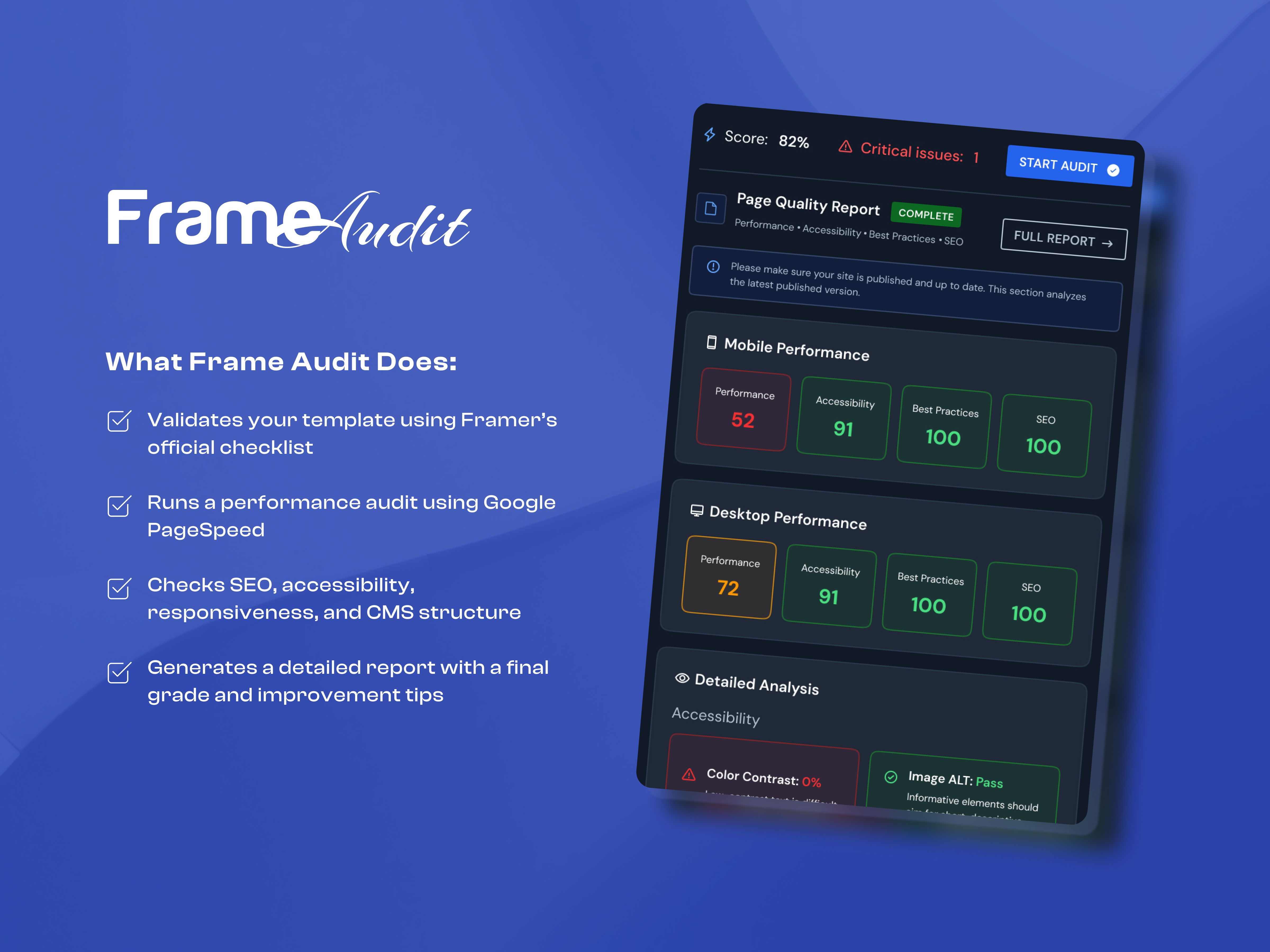 30% Launching offer discount code: CXMTAYNW. Limited time offer!Frame Audit — Ship Marketplace-Ready Templates Faster The all-in-one QA and performance plugin for Framer creators. Frame Audit checks your template against the official Framer Marketplace requirements and integrates Google PageSpeed Insights—so you can design, test, and launch with confidence. ✅ Why Frame Audit? Publishing on the Framer Marketplace is competitive. Every small detail matters: responsiveness, accessibility, SEO tags, image optimization, performance scores. Miss just one requirement, and your template risks rejection or lower visibility. Frame Audit is your built-in quality partner.It automatically scans your template, flags missing requirements, and gives you a clear pass/fail breakdown. On top of that, you can run full Google PageSpeed tests directly inside Framer, no external tools required. 🔑 Core Features 📋 Marketplace Checklist Audit Runs your template against the official Framer Marketplace requirements.Flags missing meta tags, broken links, accessibility gaps, inconsistent styling, and unresponsive layouts.Guarantees your template checks every box before submission. ⚡ Integrated Google PageSpeed Insights Test your template’s loading speed directly inside the plugin.Get real-time insights into Core Web Vitals: performance, accessibility, best practices, and SEO.Optimize before you submit—without switching tabs. ♿ Accessibility Checker Detects missing alt text and accessibility issues.Ensures your template is usable for everyone and marketplace-compliant. 🔍 SEO Essentials Scans for proper meta titles, descriptions, canonical tags, and heading structure.Improves discoverability and drives more organic traffic to your templates. 📱 Responsiveness Validator Checks your template across all breakpoints.Flags layouts that aren’t optimized for tablet or mobile screens.Guarantees a flawless experience on every device. ⏳ Time-Saving Automation No more checking each requirement manually.Automated checks catch issues early.Focus your energy on design, not tedious QA. 🌟 Benefits at a Glance First-Time Approval ConfidenceMeet every marketplace requirement and ship faster with fewer revisions.Accessibility = More ReachInclusive templates perform better and stand out in the marketplace.SEO = More VisibilityBuilt-in SEO checks help your templates rank, attract traffic, and boost sales.Responsiveness = Better ReviewsA seamless experience across devices leads to happier customers and higher ratings.Performance That SellsSpeed matters. Templates that load faster get better user trust and conversions.Save Time, Work SmarterStop wasting hours on repetitive checks. Automate QA and focus on creativity. 🎯 Who It’s For Template Creators who want first-time approvals and better sales.Freelancers & Agencies delivering premium, marketplace-compliant Framer sites.Productized Designers scaling their template business without losing quality. 🏆 Why Top Creators Love It Frame Audit isn’t just a plugin. It’s your silent QA partner—catching details you might overlook and giving you confidence that your template is marketplace-ready, fast, and optimized to sell. 🚀 Get Started Don’t let small oversights cost you approvals, sales, and reputation.With Frame Audit, you’ll never have to wonder if your template is “ready” again. 👉 Install Frame Audit today. Ship faster. Sell more.