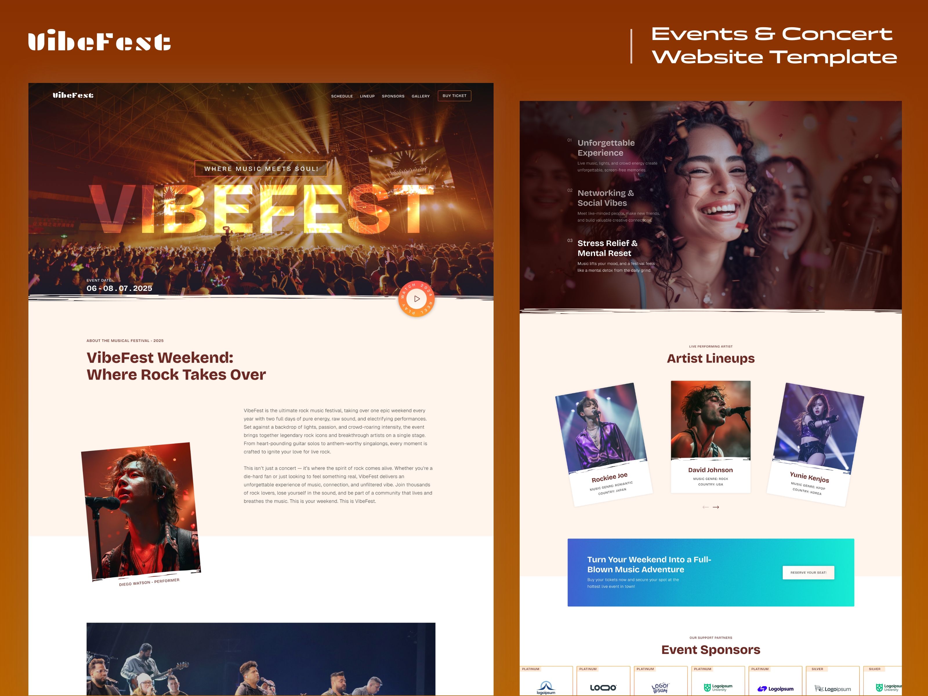 Turn Up the Volume on Your Event Website with VibeFest – the ultimate Framer template designed exclusively for concerts, music festivals, and live events. With its electrifying design, bold visuals, and smooth interactions, VibeFest helps you capture the energy of your event before it even begins. Whether you're hosting a local gig or a multi-day music festival, this template makes it ridiculously easy to showcase artist lineups, sell tickets, and keep fans in the loop — all in one scroll-stopping experience. Ready to launch a website that hits all the right notes? VibeFest isn’t just a template — it’s your all-access pass to a high-converting, mobile-optimized, and lightning-fast event site. Stop wasting time piecing together clunky layouts. Grab VibeFest today and get your event website live in hours, not weeks. Let the countdown to sold-out shows begin. Pages: Home PageSchedule PageLineups PageSponsors PageGallery PageTicket PagePrivacy Policy PageTerms & Conditions Page404 Error PageRefund Policy:All digital sales are final, and refunds are not available. Ensure you’ve reviewed the product details, and feel free to ask any questions before purchasing.Exclusive Offer:Get 3 months of Framer Pro (annual plan) free with your template purchase. Use the provided discount code when subscribing to a Framer Pro plan. partner25proyearlyPreview HereRefund Policy